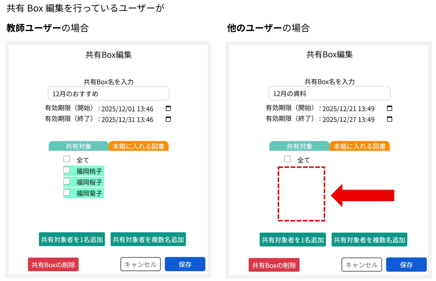 共有する図書を選択後、「共有Boxの編集」を『保存』すると、共有対象者の共有Box一覧に、共有Box名が表示されます。
