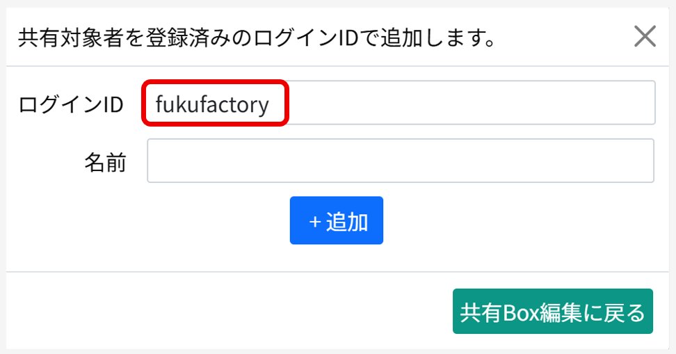 「登録しました」のメッセージが表示され、「共有Boxの編集」を開くと【共有対象】には、登録したユーザーの名前が、チェックが付いた状態で表示されます。