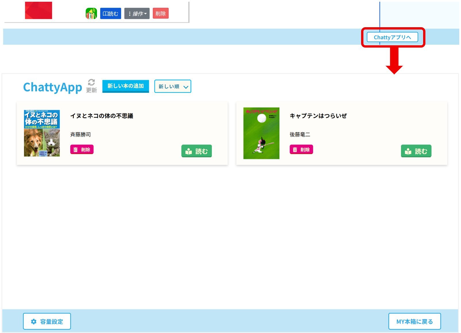 MY本箱右下の『Chattyアプリへ』をクリックすると、アプリ画面に切り替わります。