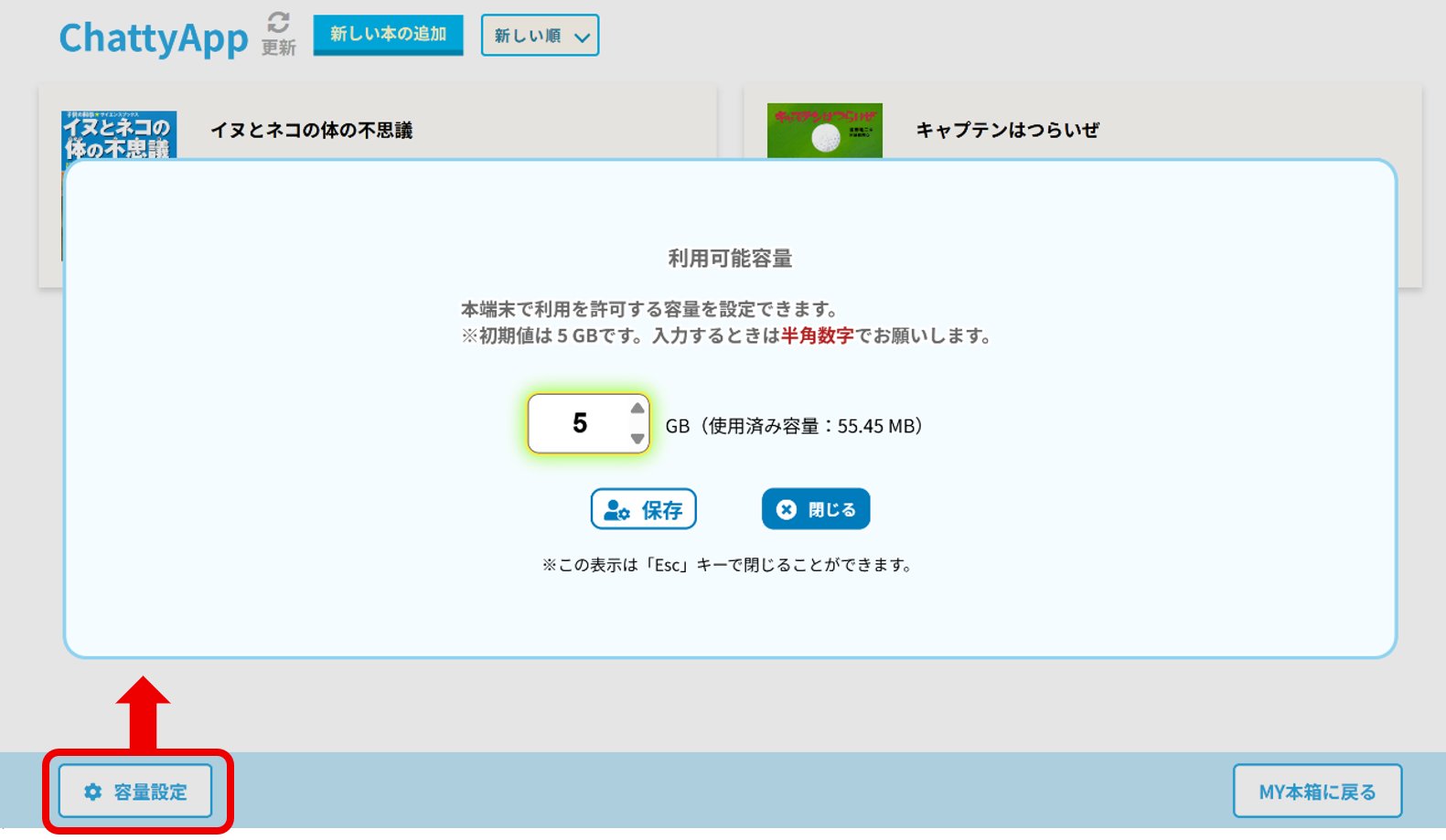 アプリ画面左下の『容量設定』をクリックすると、アプリが利用するストレージ容量を設定することができます。(初期値:5GB)使用済み容量の確認も行うことができます。