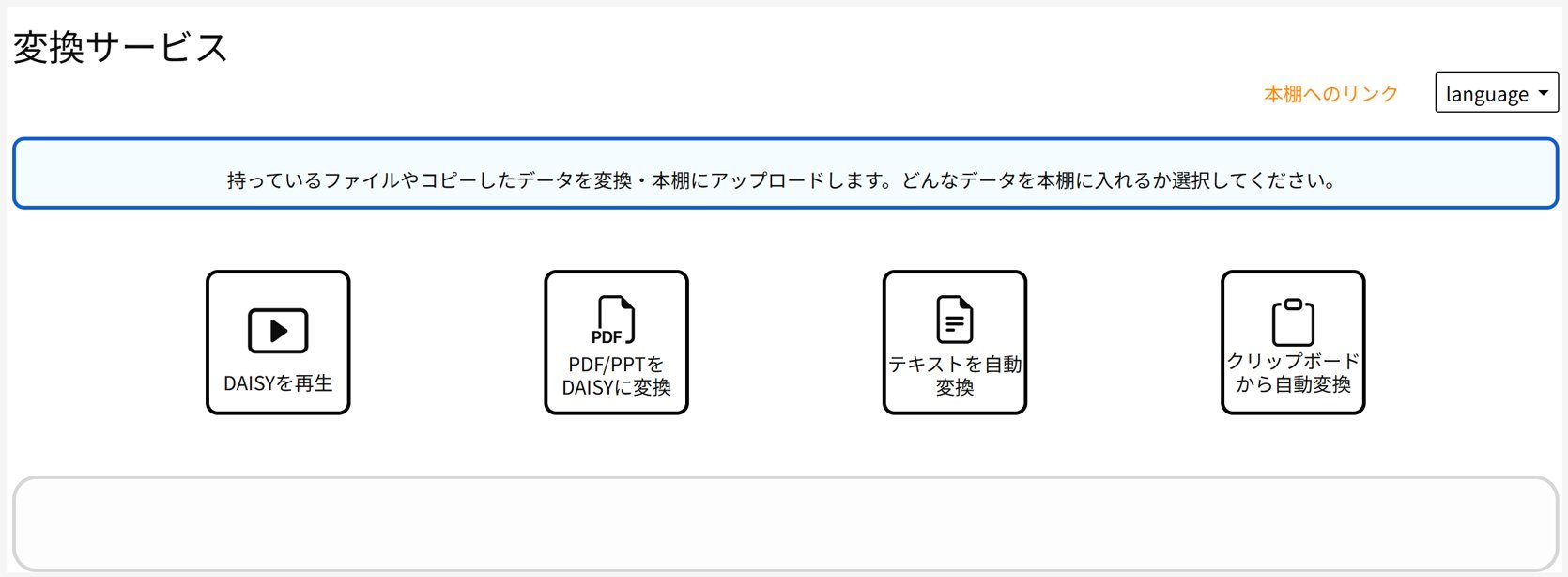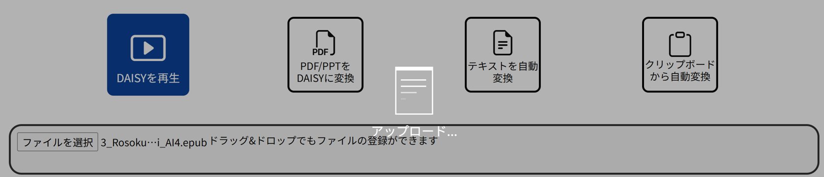 変換サービスは、『DAISYを再生』『PDF/PPTをDAISYに変換』『テキストを自動変換』『クリップボードから自動変換』の4種類があります。