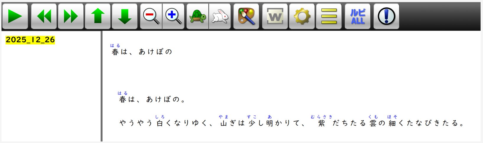 - 固定:原本イメージと同じレイアウトで、画像にある文章をハイライトして読み上げます。ルビは原本にあるルビのみで付けることはできません。