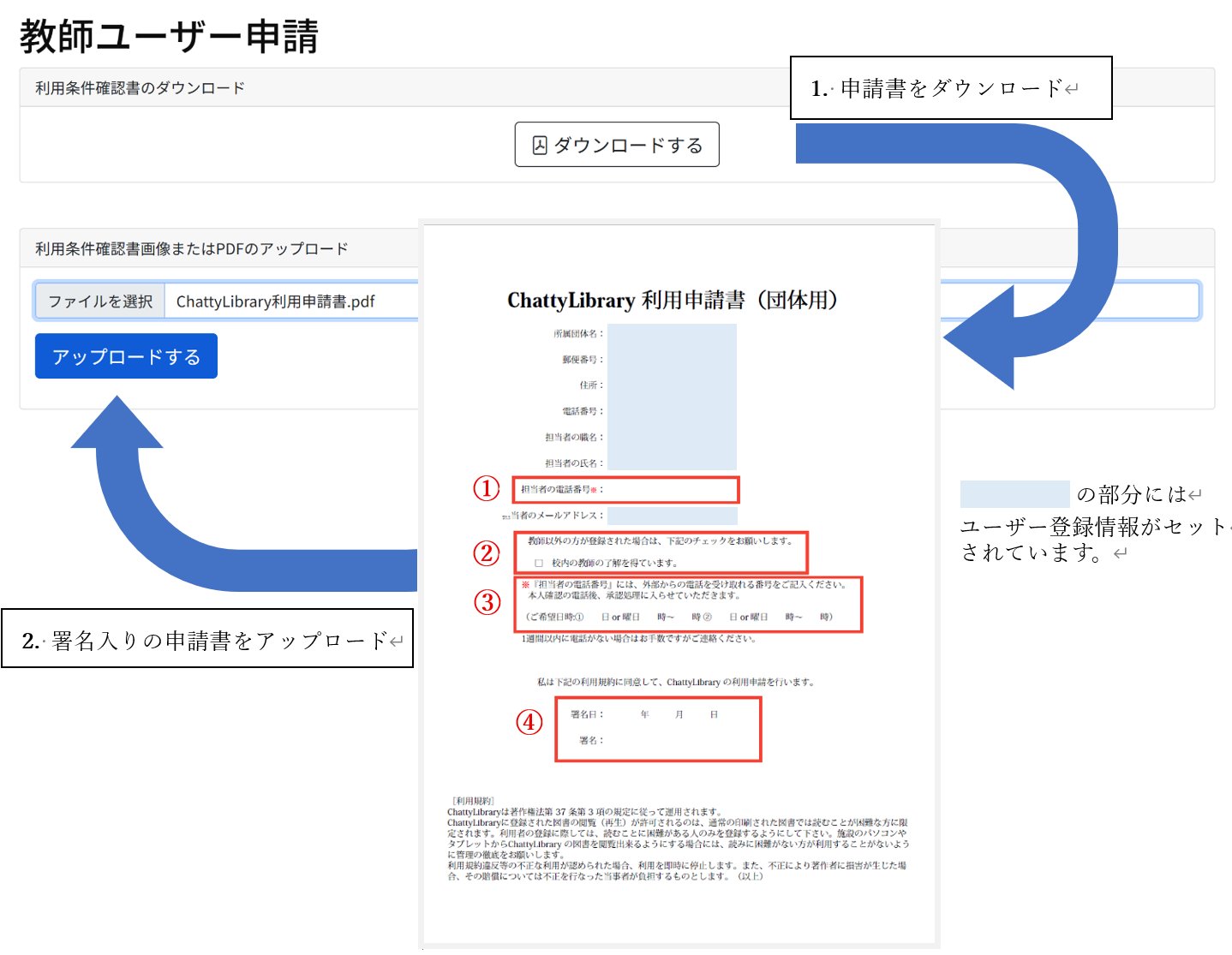 2. 利用申請書をダウンロードし、下記必要事項を記入後、アップロードします。