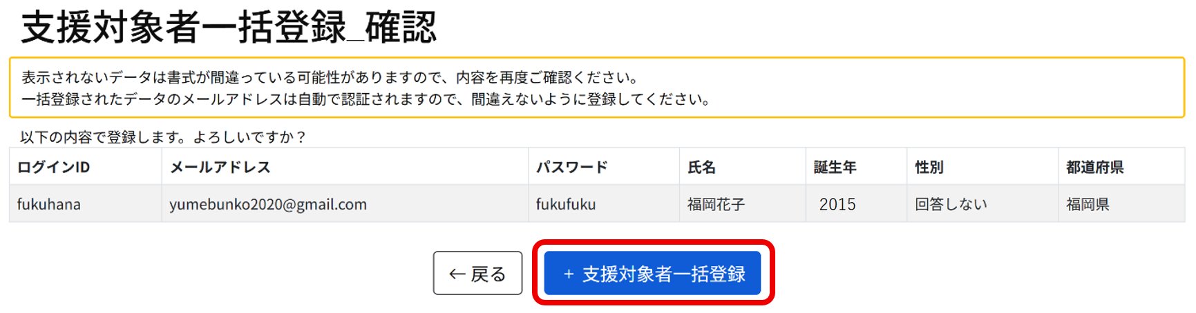 「支援対象者一括登録_確認」ページが開き、先程入力した児童・生徒の情報が表示されます。