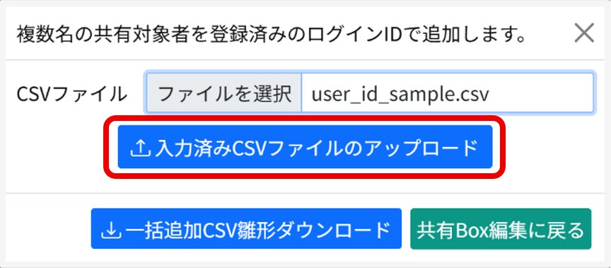 「登録しました」のメッセージが表示され、「共有Boxの編集」を開くと【共有対象】には、登録したユーザーの名前が、チェックが付いた状態で表示されます。