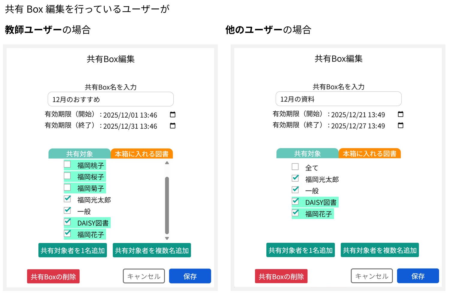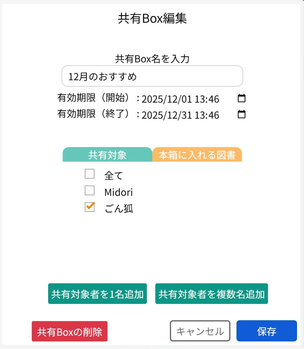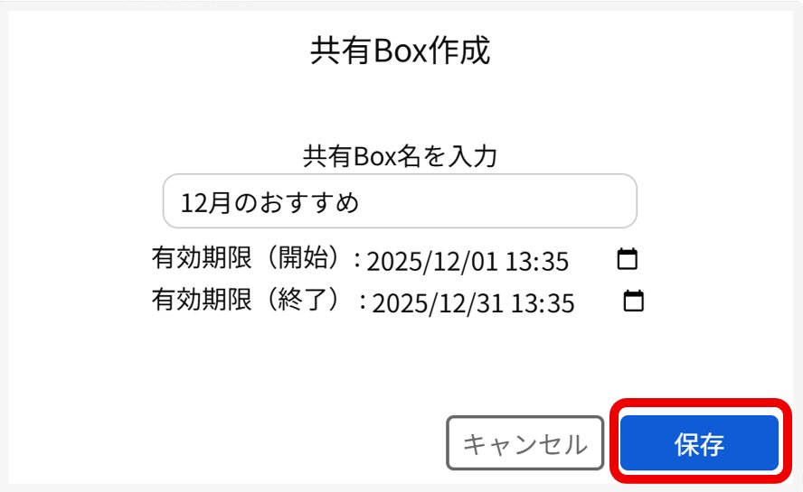 共有する図書を選択後、「共有Boxの編集」を『保存』すると、共有対象者の共有Box一覧に、共有Box名が表示されます。