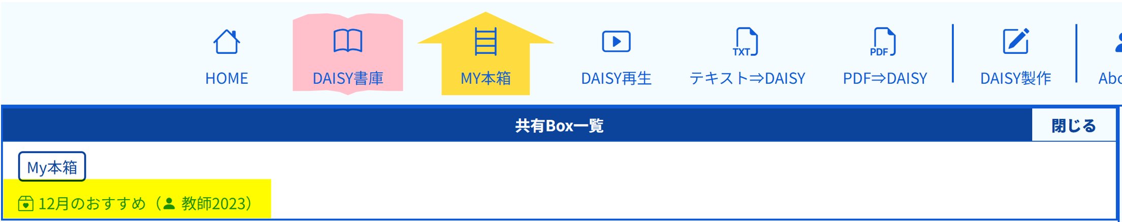 共有Boxは、MY本箱の図書を、他のユーザーに配布するサービスです。全ユーザーが、利用することができます。