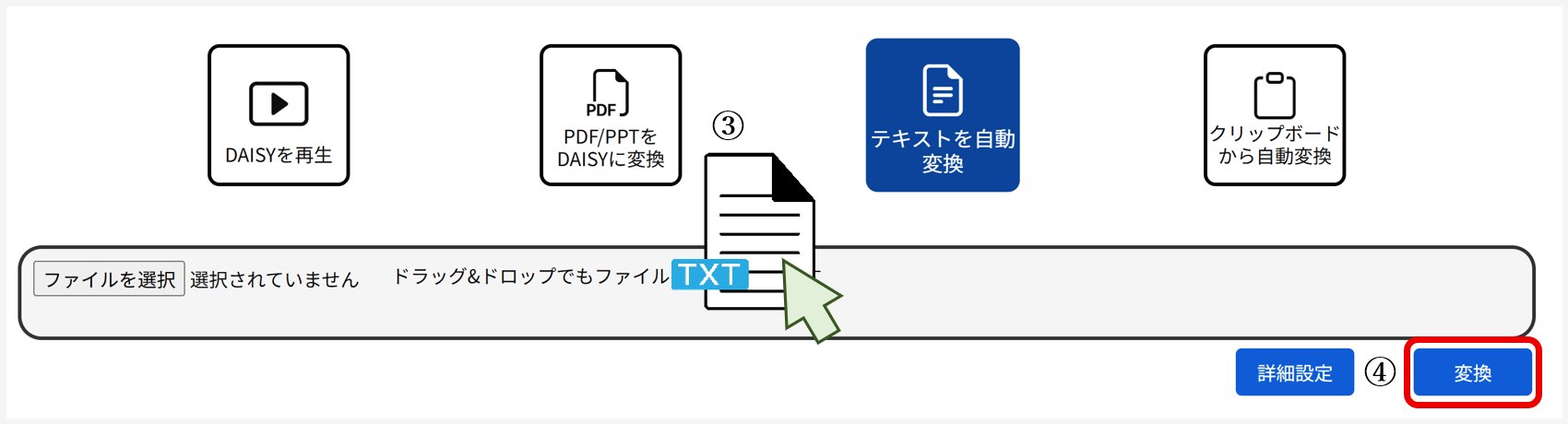 ③ テキストファイルを選択、またはファイルエリアにドラッグ&ドロップします。