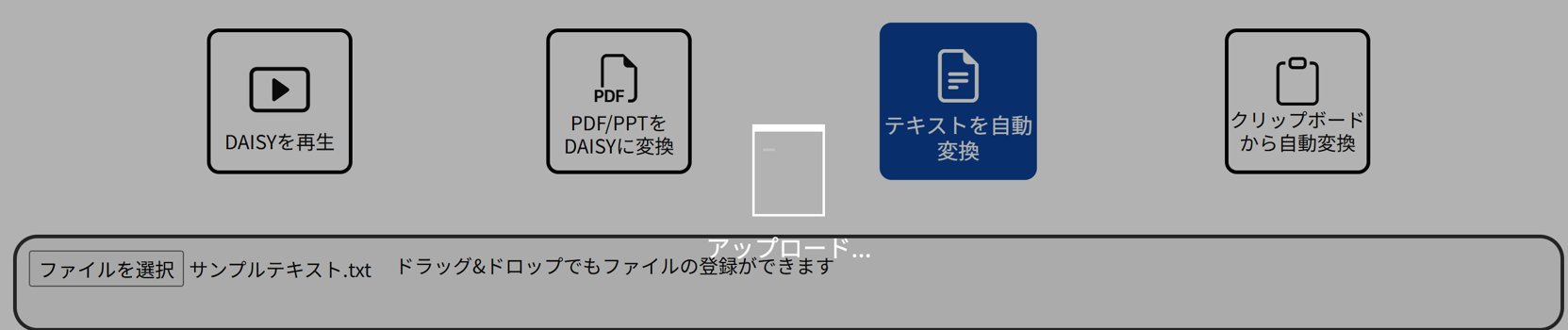 変換サービスは、『DAISYを再生』『PDF/PPTをDAISYに変換』『テキストを自動変換』『クリップボードから自動変換』の4種類があります。