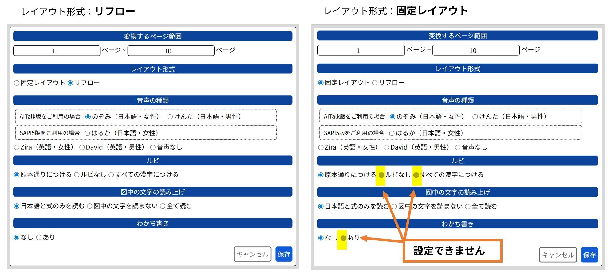 - 固定:原本イメージと同じレイアウトで、画像にある文章をハイライトして読み上げます。ルビは原本にあるルビのみで付けることはできません。